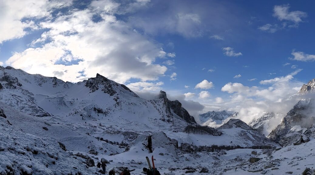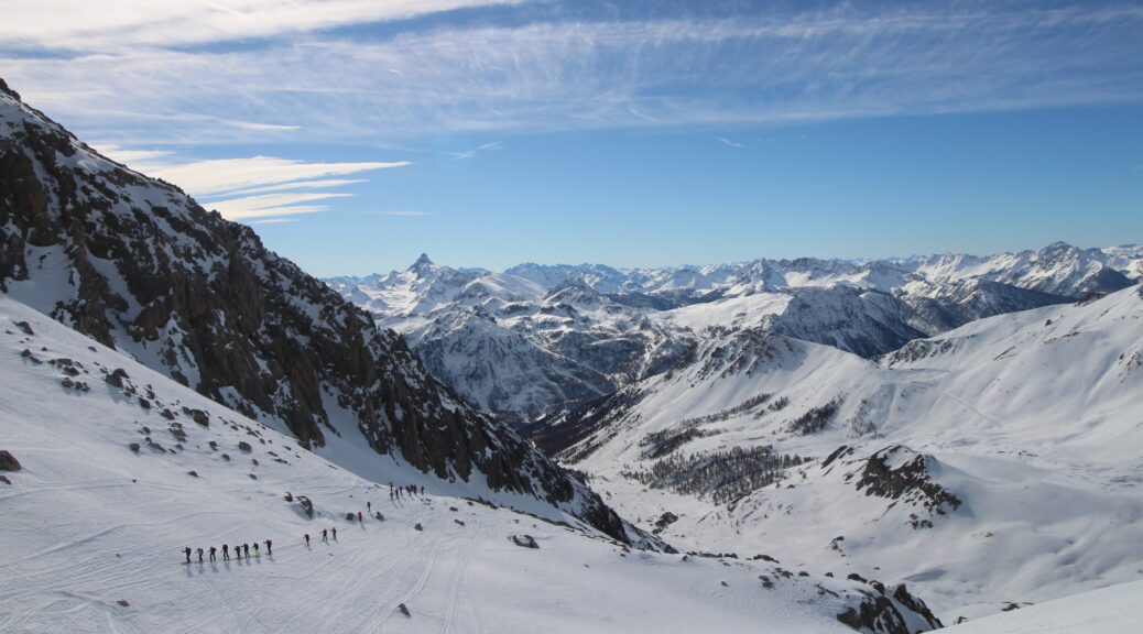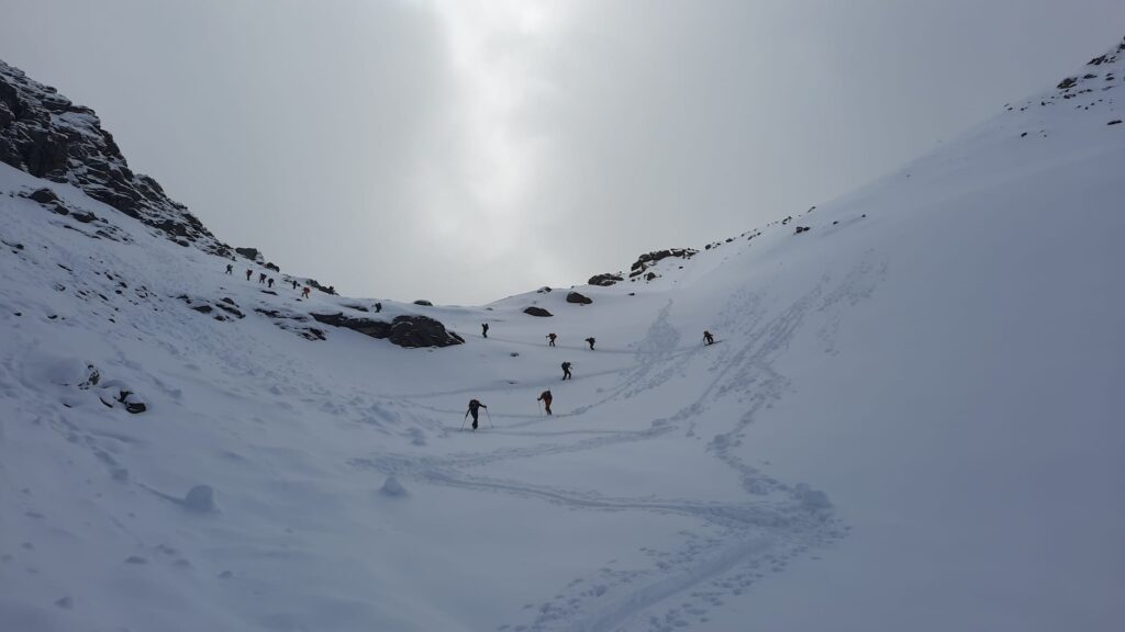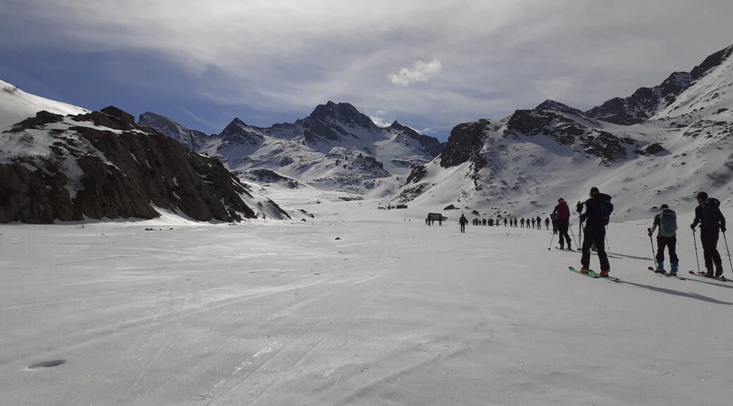 Come ci ricordano Carlo e Federica (che ringraziamo per la relazione di questa ultima gita), le parole di Cognetti risuonano perfettamente dentro a tutti noi amanti della montagna e in particolare a noi scialpinisti che siamo un po’ una “bestia strana“. E sì, amanti del dislivello prima ancora che della discesa (eh già diciamocelo, se no chi ce lo farebbe fare?! saremmo tutti freerider!), amanti di grandi fatiche e disposti ad accettare sveglie sempre più improbabili e improponibili man mano che la stagione avanza…e per cosa? per la ricerca della neve? del perfetto firn, di quella morbida sensazione che lo sci dà sulla superficie innevata? un incredulo interlocutore ci potrebbe domandare – beh..ma con quale frequenza la trovate? e per quanto tempo nell’arco di una gita? A quel punto un po’ di imbarazzo probabilmente calerebbe .. Come glielo spiego che sì e no una mezz’ora di discesa su tutta una giornata di fatica e di ravanage?! … e quindi, cosa? la ricerca dell’avventura? o la vista degli orizzonti immensi? il brivido del pendio? la gioia della curva ben impostata? sì certamente ma forse è anche la sfida della ricerca stessa: leggere bollettini, meteo e relazioni e provare a trovare il luogo perfetto. E poi lì, lungo la traccia, e poi dopo, in cima al pendio, a guardare, scrutare i bianchi pendii e i vicini avvallamenti sempre alla ricerca del passaggio perfetto, alla ricerca di quella amata sensazione sotto i nostri piedi ( e sì! anche i piedi sentono, eccome, chiedetelo a uno scialpinista!) ..qualunque sia il mix che ci porta lassù non c’è niente da fare lì ci vedrete scappare appena possibile 😉 . Carlo e Federica, a voi la parola!