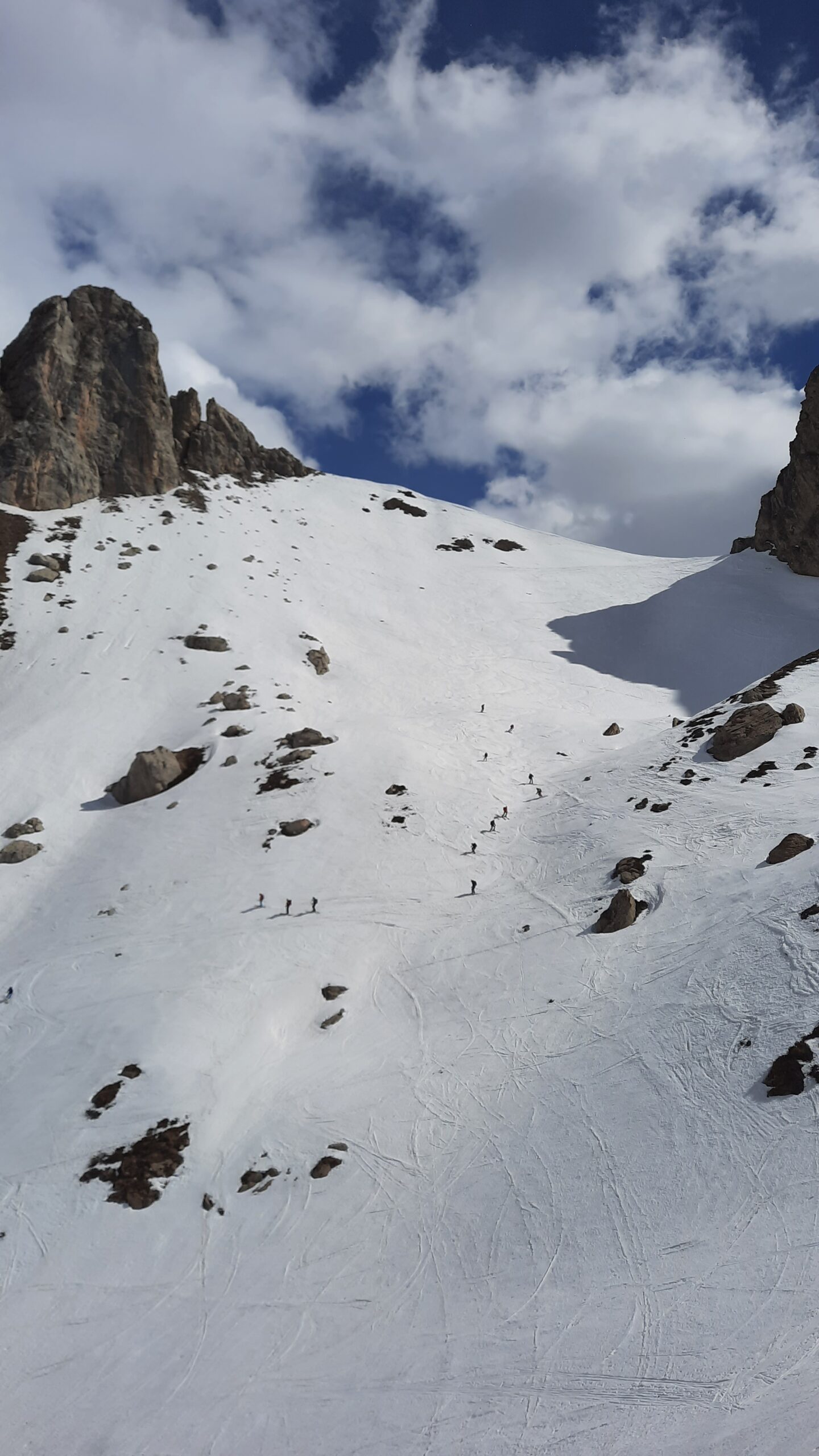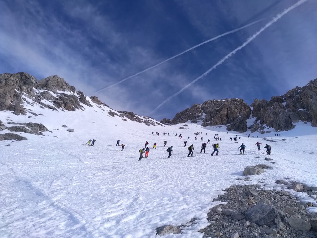 Dopo bella salita tra pendii finalmente innevati, a tratti ripidi, con guche talvolta impegnative su neve infida, davanti a noi si para il canalino Nord della fascia. Calziamo i ramponi, rimettiamo gli sci sugli zaini, ma non per salire tra i mughetti, bensì per l’arduo cimento. Il canalino ha una pendenza intorno ai 35°/40°, richiede cautela nella salita, come ci ricorda un cellulare che ad un certo punto imbocca il pendio in senso inverso al nostro a velocità sostenuta, battendo il record di rimbalzi su neve (verrà recuperato, miracolosamente integro, al ritorno).