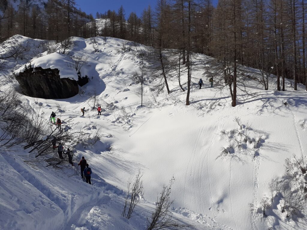La prima parte di gita, che è la stessa che percorsi per arrivare in cima allo Chaberton (in estiva però), è piuttosto dolce, attraverso il bosco, con sole ed ombra che si alternano. Questo segmento della gita mi piace sempre molto, perché si socializza con nuovi compagni di avventura, con i quali, quantomeno per la giornata che si sta vivendo, si crea inevitabilmente una sorta di filo d’unione.