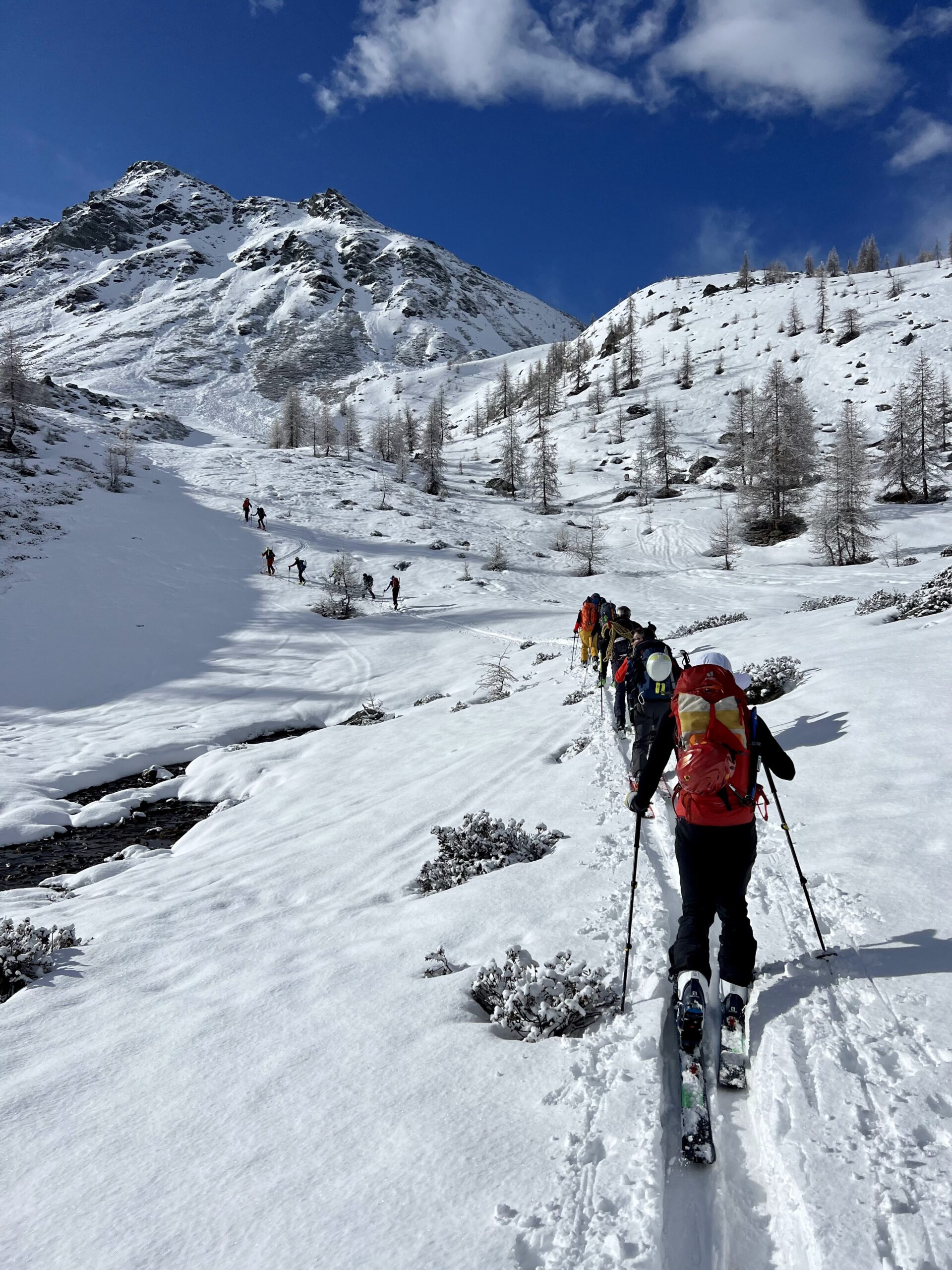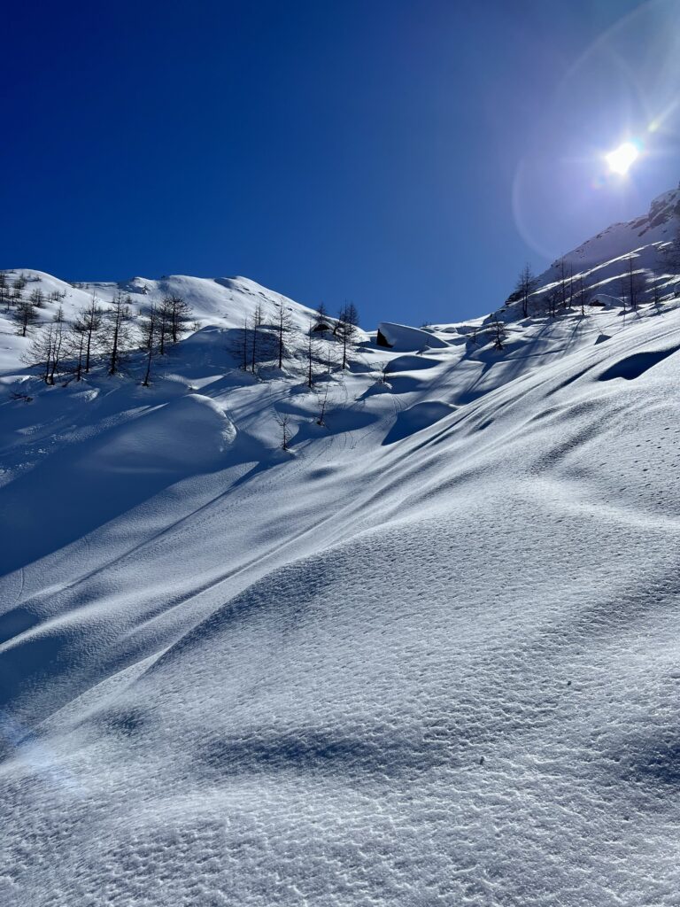 Guardandoci intorno e chiacchierando con gli istruttori, sembrava che la recente nevicata non avesse causato valanghe. Ma nonostante cio’, consci che il rischio valanghe quel giorno era tra il 2 e il 3, di fronte a un canalino da attraversare siamo andati prudentemente uno alla volta.
