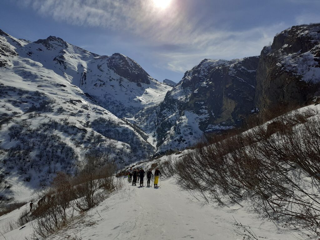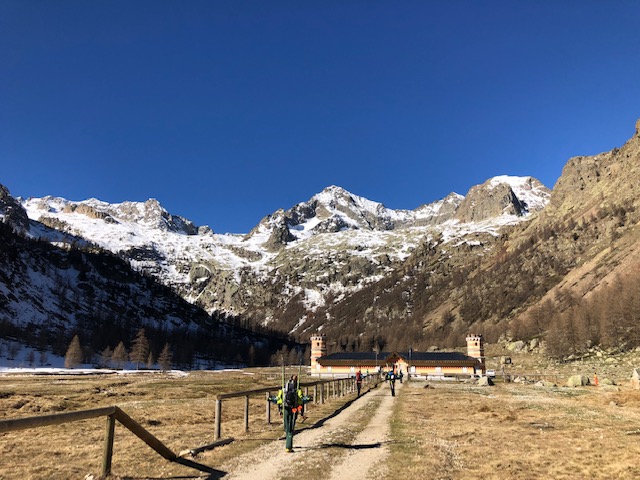 Carichiamo gli zaini con sci e scarponi. Solo pochi impavidi scelgono di partire con gli scarponi ai piedi. Risaliamo la valle di Valasco sotto una bellissima faggeta che costeggia il torrente omonimo e in poco più di un’ora arriviamo al pianoro del mitico Rifugio Valasco (mt. 1763), un luogo speciale che trasuda di storia visto che è stato “Reale Casa di Caccia” ed ha ospitato per anni Vittorio Emanuele II e altri membri della allora famiglia reale.