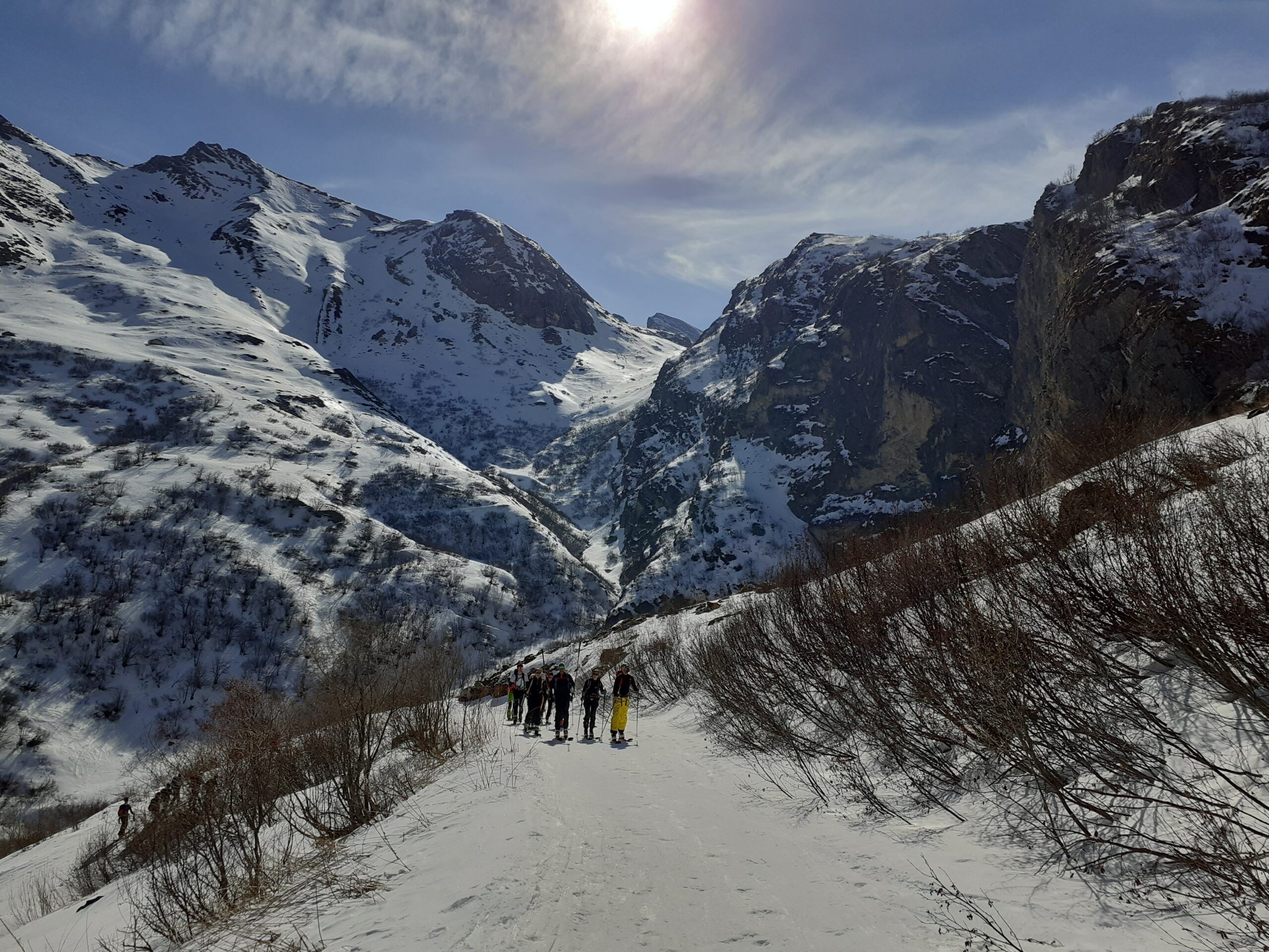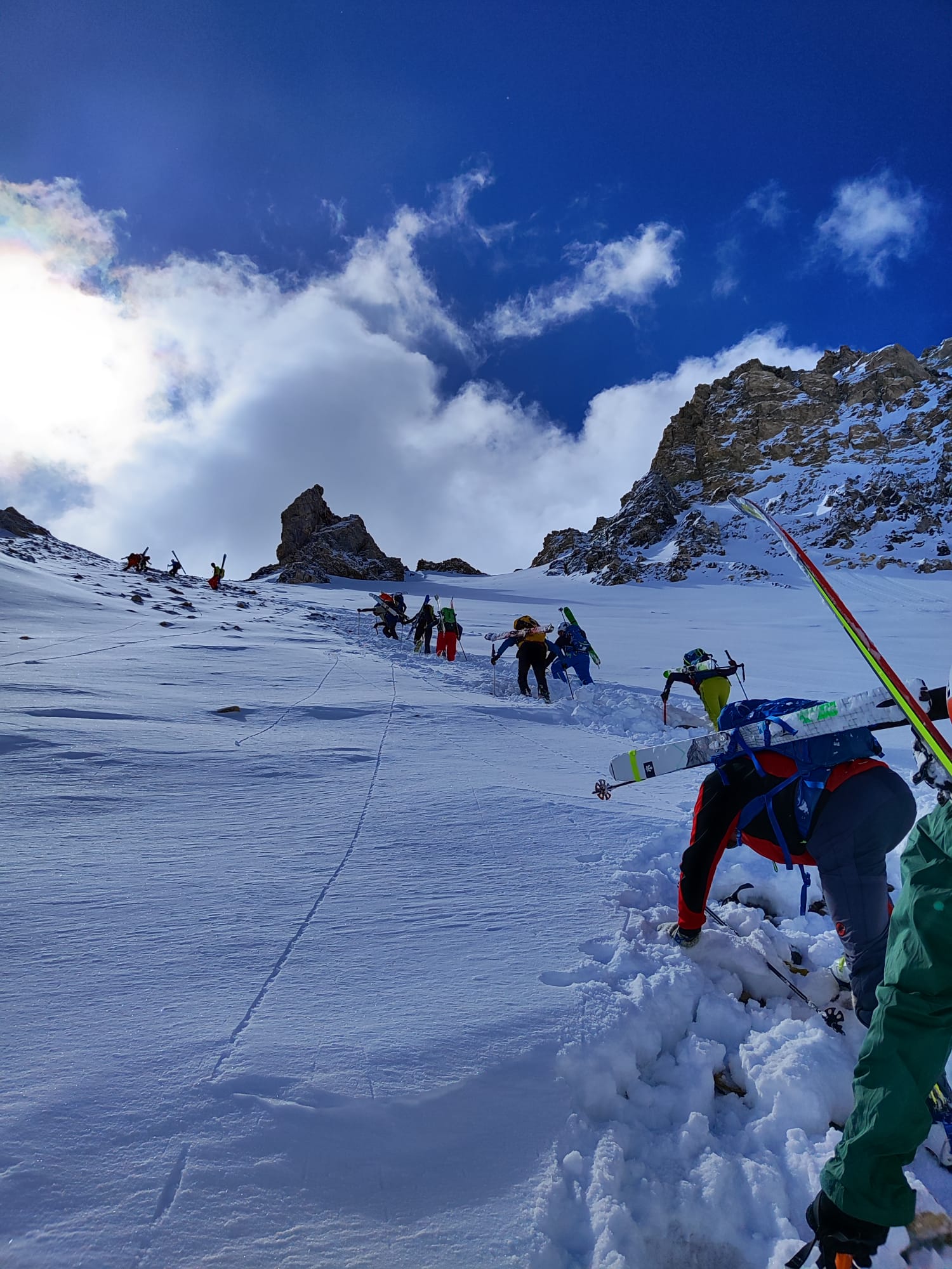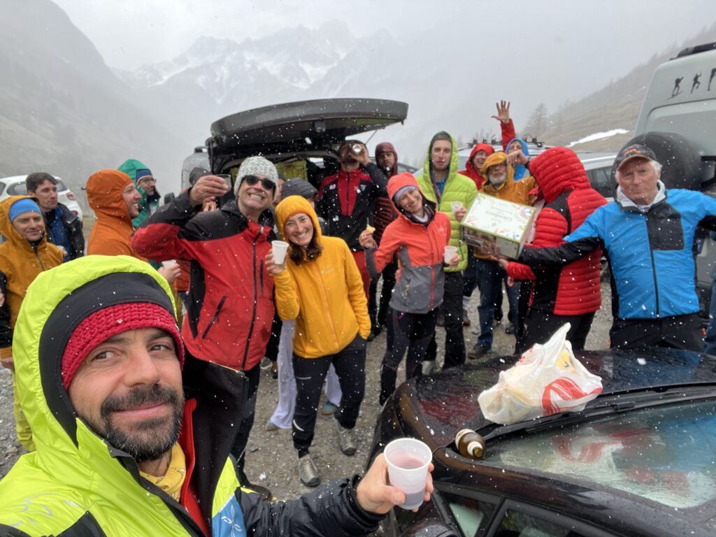 Giunti a Sant’Anna di Bellino, l’avvio verso il colle di Vers è tranquillo, si percepiscono un’atmosfera di grande entusiasmo e voglia di mettersi alla prova. La salita ci regala una vista spettacolare: montagne innevate, pareti di roccia e scolpiti polpacci di compagni ed istruttori che, risoluti a non abbandonare lo stile, decidono di salire con i risvoltini.