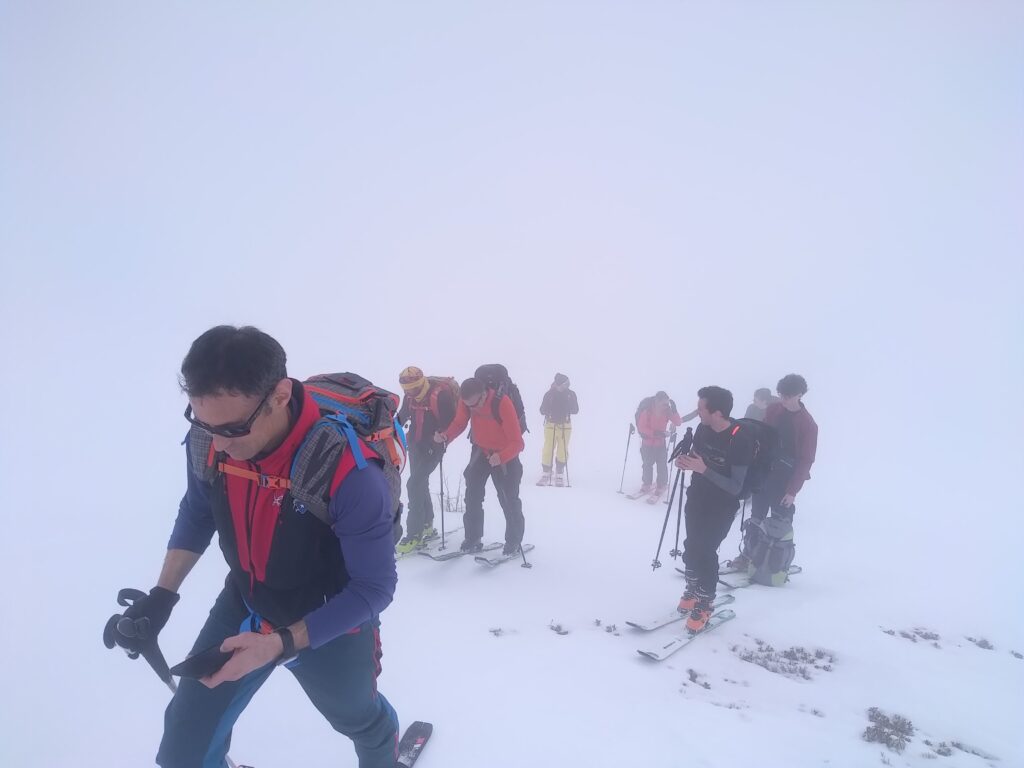Dopo il boschetto il percorso continua in falsopiano fino ad un’ultima salita. Quasi in cima, la nebbia ci circonda; una breve pausa per compattarci , e- lasciati gli sci sul colletto – raggiungiamo la cima del Monte Cugulet a piedi (la neve sembra scarseggiare anche qui). Ci fermiamo a chiacchierare e scattare foto, nella vana speranza che una fugace schiarita ci permetta di intravedere il panorama.