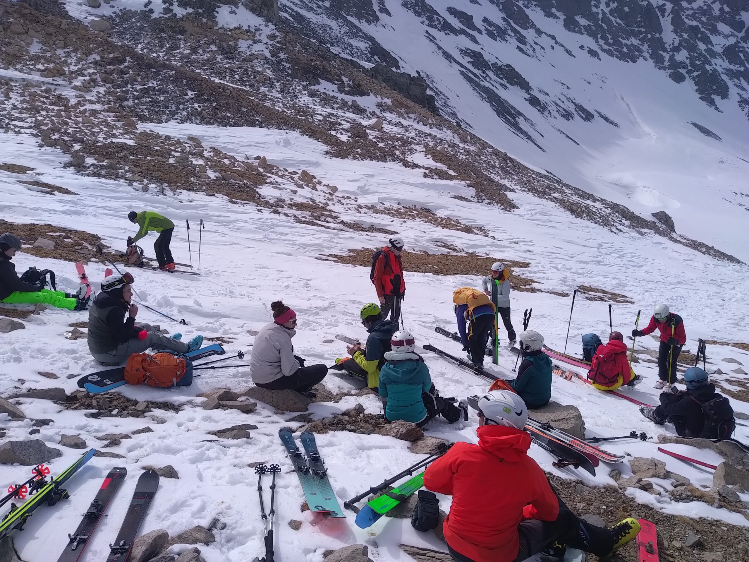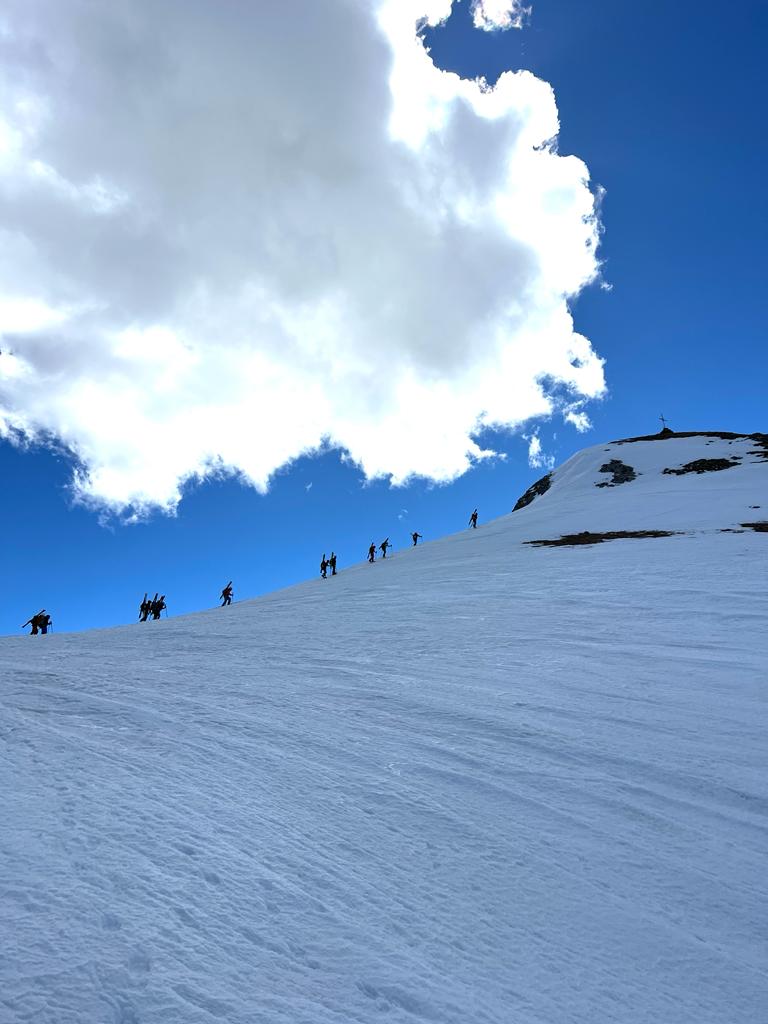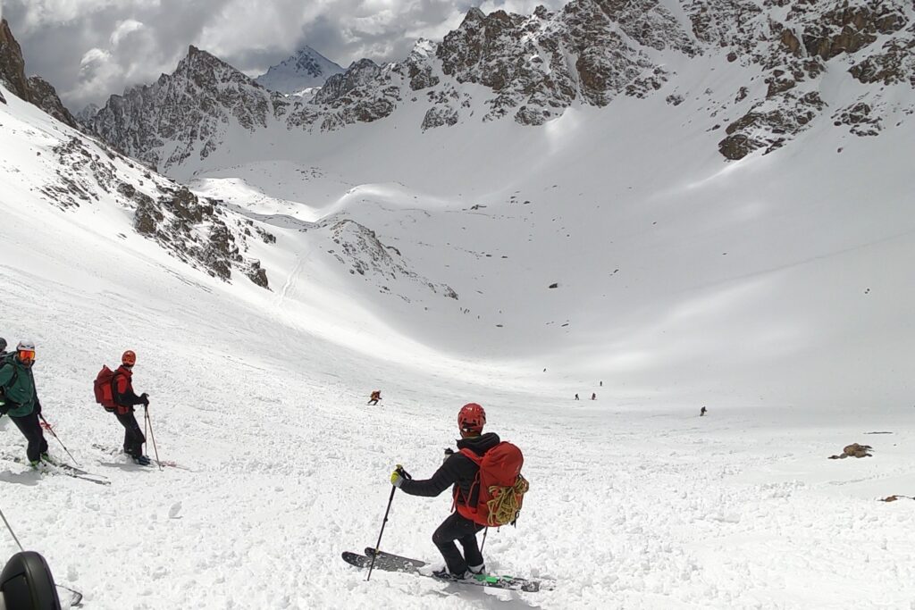 Zaini in spalla e ci avviamo alla ricerca dei tratti migliori per scendere. La neve sembra meglio del previsto e i larghi canali fanno sembrare per un attimo di sciare lungo un half-pipe. Non mancano tuttavia correzioni e saggi consigli da parte degli istruttori: si cerca di correggere l’impostazione della curva, di notare i punti più pericolosi e i cambiamenti di consistenza della neve, si provano le curve con due bastoncini e saltate, alla continua ricerca dei tratti più ripidi. Quale miglior momento per uscire dalla propria comfort zone se non durante un corso?