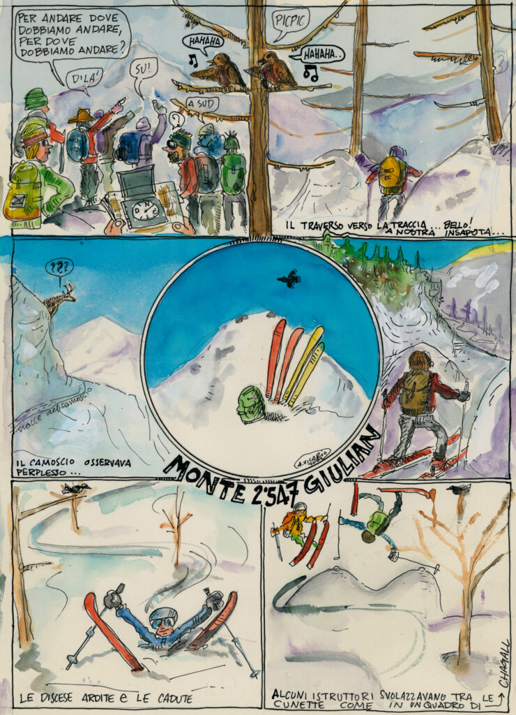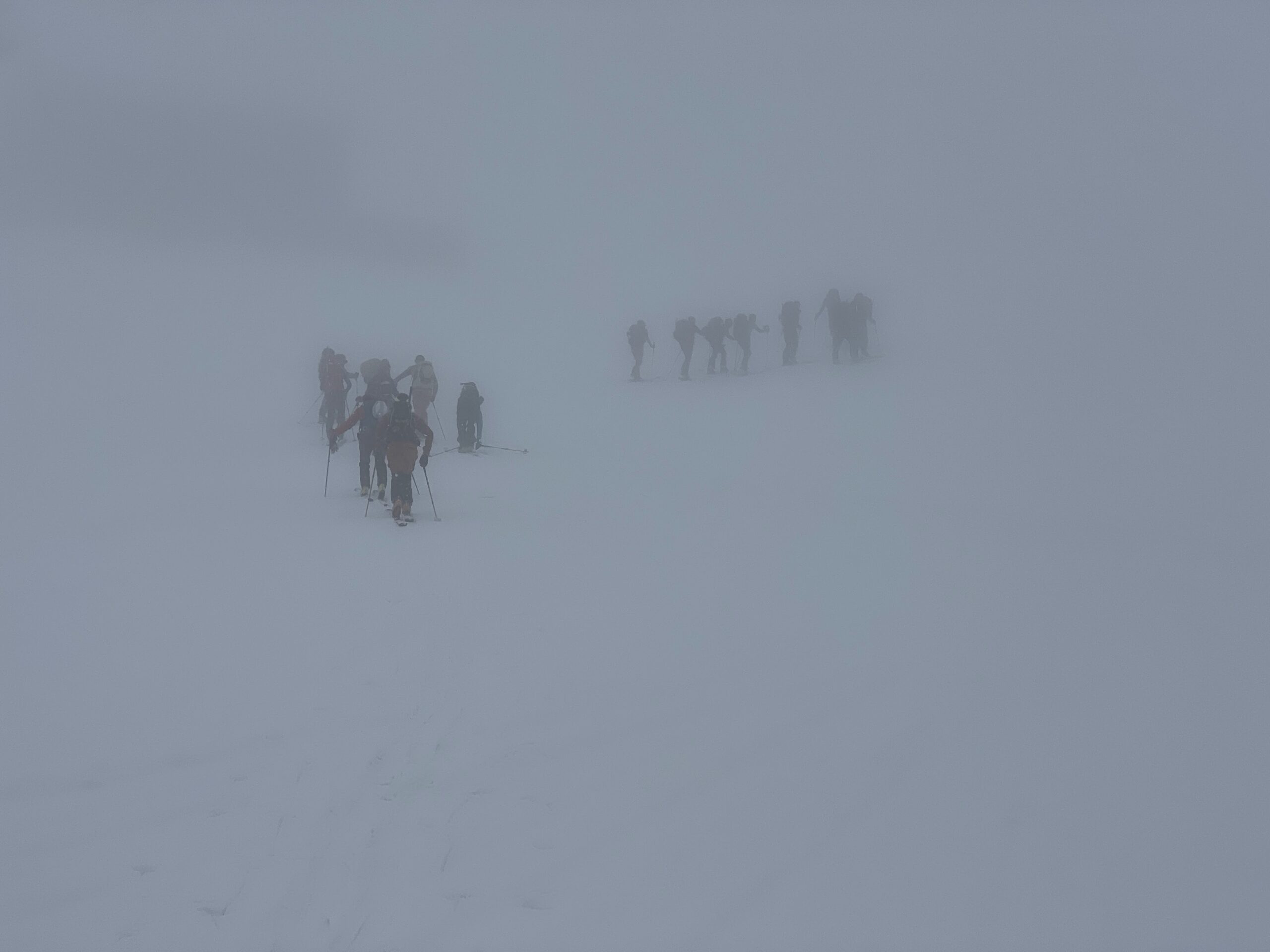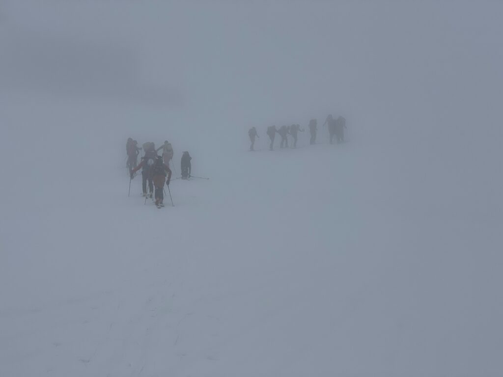 Ci aspetta la prima discesa del corso in condizione di scarsa visibilità; cautamente, l’ex Diretùr ci fa strada nella nebbia che ci impedisce di vedere la trama della neve, e più volte gli sci scappano, come dotati di una volontà tutta loro.