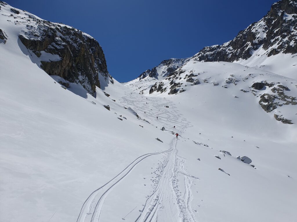Subito dopo il lago, su un pendio particolarmente ripido passiamo uno alla volta, tenendoci a 10 mt di distanza uno dall’altro. Mentre risaliamo a destra sul versante esposto a Est notiamo alcune cadute di neve dovute al riscaldamento delle rocce. Ci spostiamo a sinistra, sul lato destro orografico della valle, che è in ombra e più sicuro e proseguiamo fino sotto al passo.
