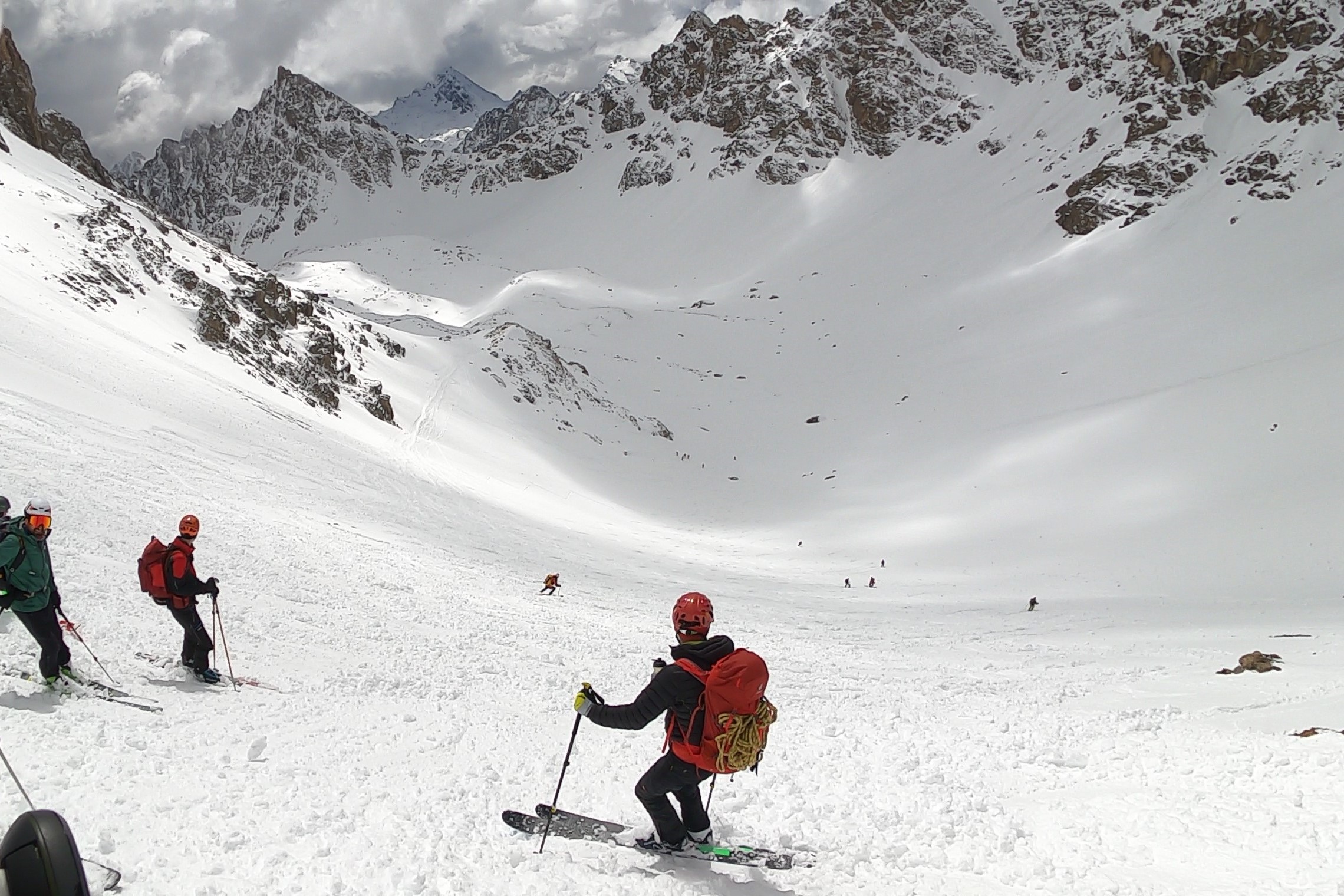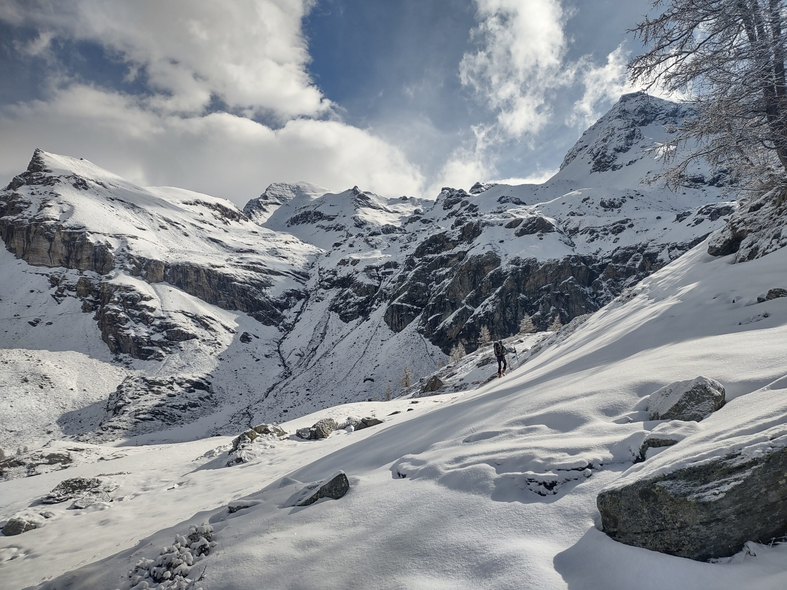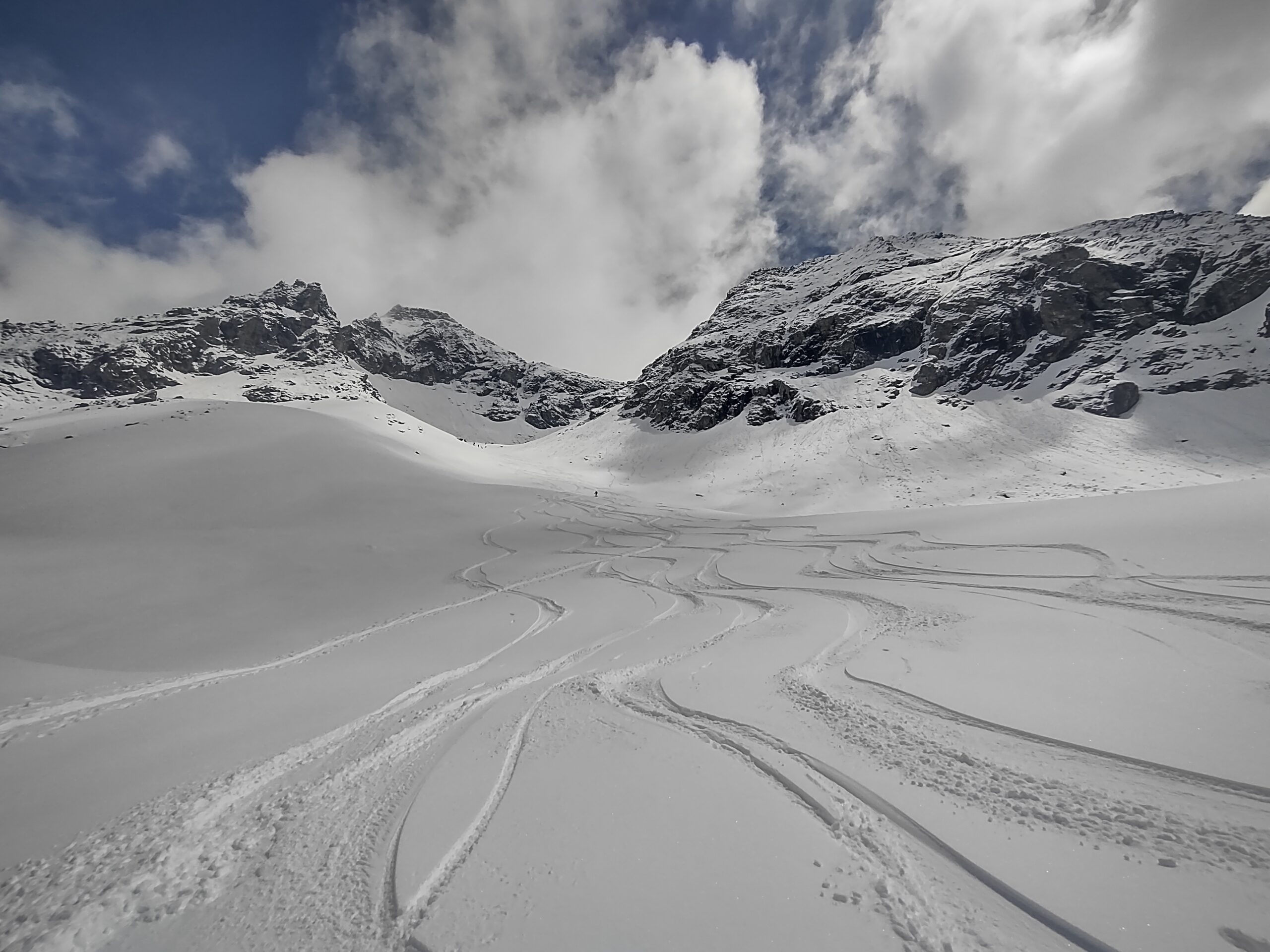 La discesa è divertente e varia: pendii ripidi si alternano a traversi, abbiamo anche una breve risalita per scavallare un colle. Neve a tratti ottima. Il meteo inizia a peggiorare: si alza il vento, iniziano a cadere le prime gocce. Anche su questo angolo delle Alpi, sapientemente scelto da Albi, vira al brutto; in Val d’Aosta è già bufera dal mattino.