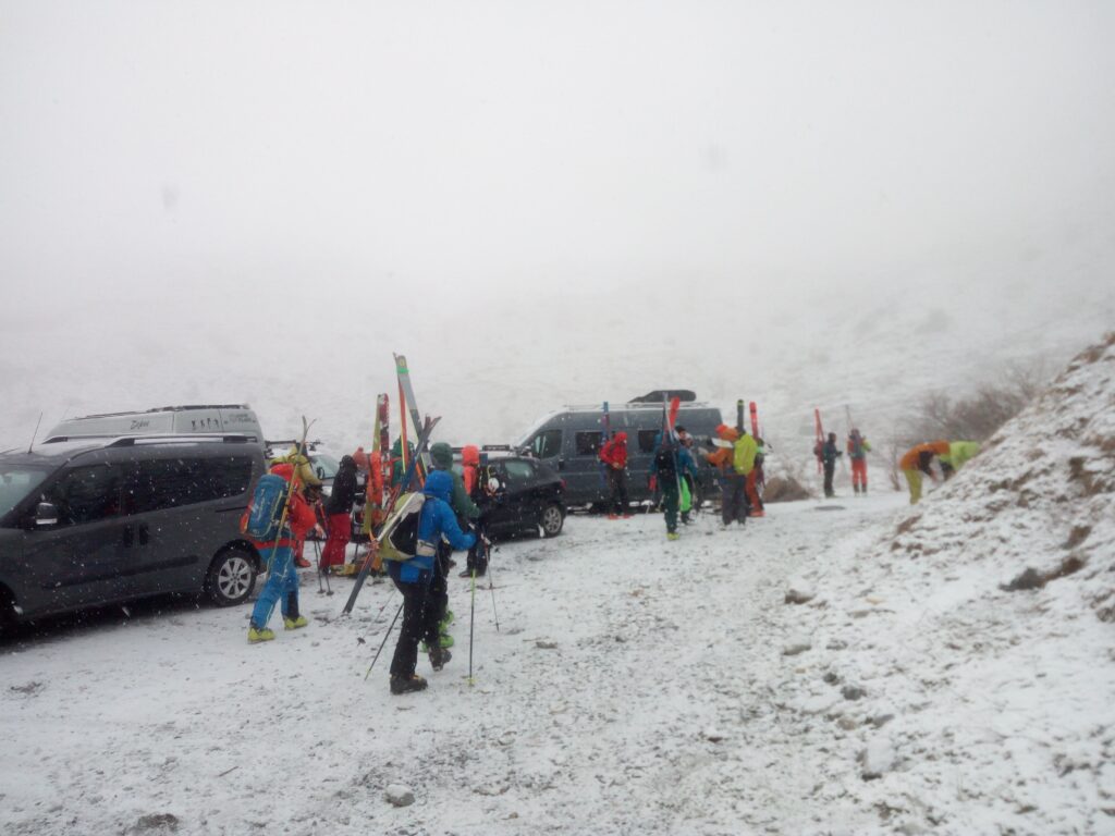 Sveglia alle 6, colazione alle 6.30, partenza alle 7. Procediamo in direzione Chiappera ed imbocchiamo con le auto una strada bianca fino a quando le condizioni lo permettono. Arrivati al parcheggio siamo coperti dalla neve che cade sulle nostre teste, ma gli istruttori ci rassicurano, la loro cugina che fa la negromante garantisce una finestra di circa 6 ore di bel tempo, quindi si parte. Questa volta il portage è limitato, circa mezz’oretta, poi sci ai piedi e via per la destinazione, la punta Ciaslaras.