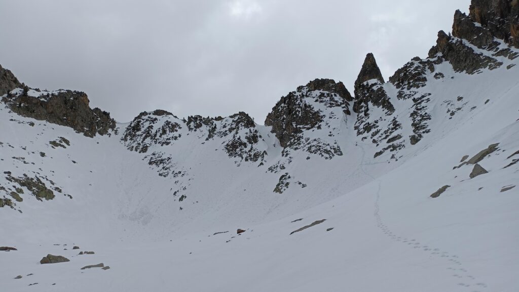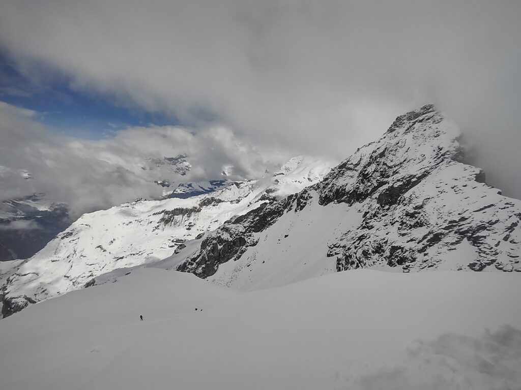 La cresta del Grand Tournalin invece, a causa della nevicata del giorno prima, è tutta imbiancata e sua salita sarebbe lunga e per nulla banale. Quindi, visto anche che nel pomeriggio è previsto un peggioramento meteo, la nostra scelta ricade sul Piccolo Tournalin (3207m).