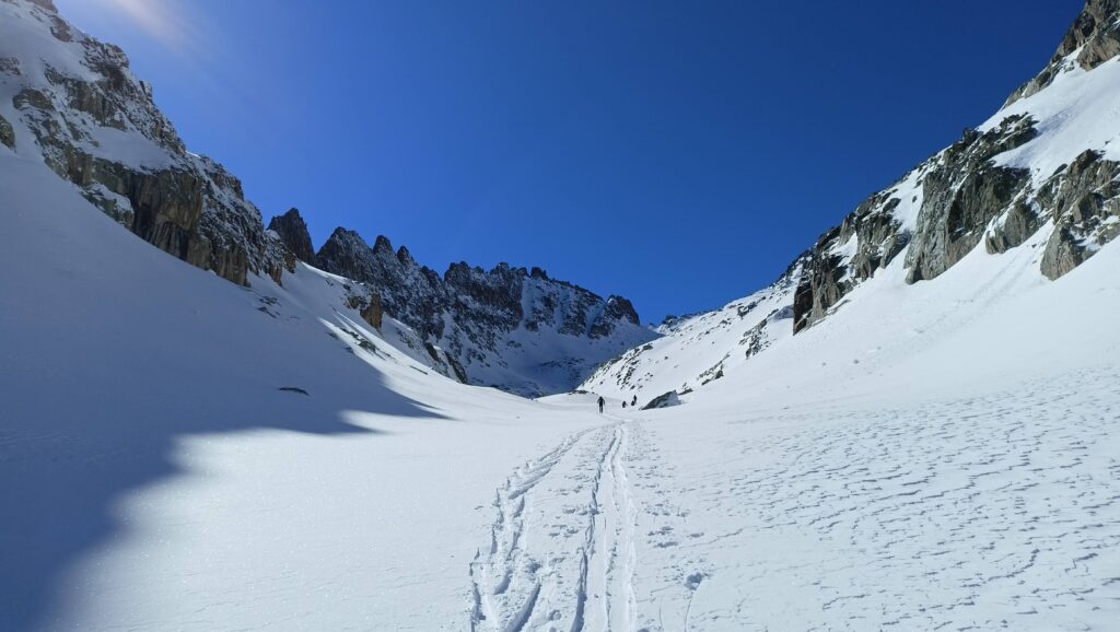 Durante la discesa, nella parte alta del percorso, troviamo neve discreta e ci togliamo qualche bella soddisfazione con curve ampie e veloci. Rientrati nel canale la musica cambia. Il fondo è duro e ghiacciato e ricorriamo al derapage per passare nei punti più difficili. Nella parte bassa del canale per fortuna il ghiaccio molla un po’ e riusciamo a fare qualche serpentina fino a fondo valle.