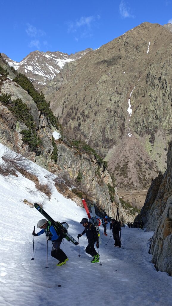 Iniziamo la salita lungo una stretta stradina che presto dobbiamo condividere con i partecipanti alla gara di sci alpinismo! Dopo averli fatti passare e ammirato la loro velocità e instancabile fiato, continuiamo per la nostra stradina che presto diventa un ripido sentiero.