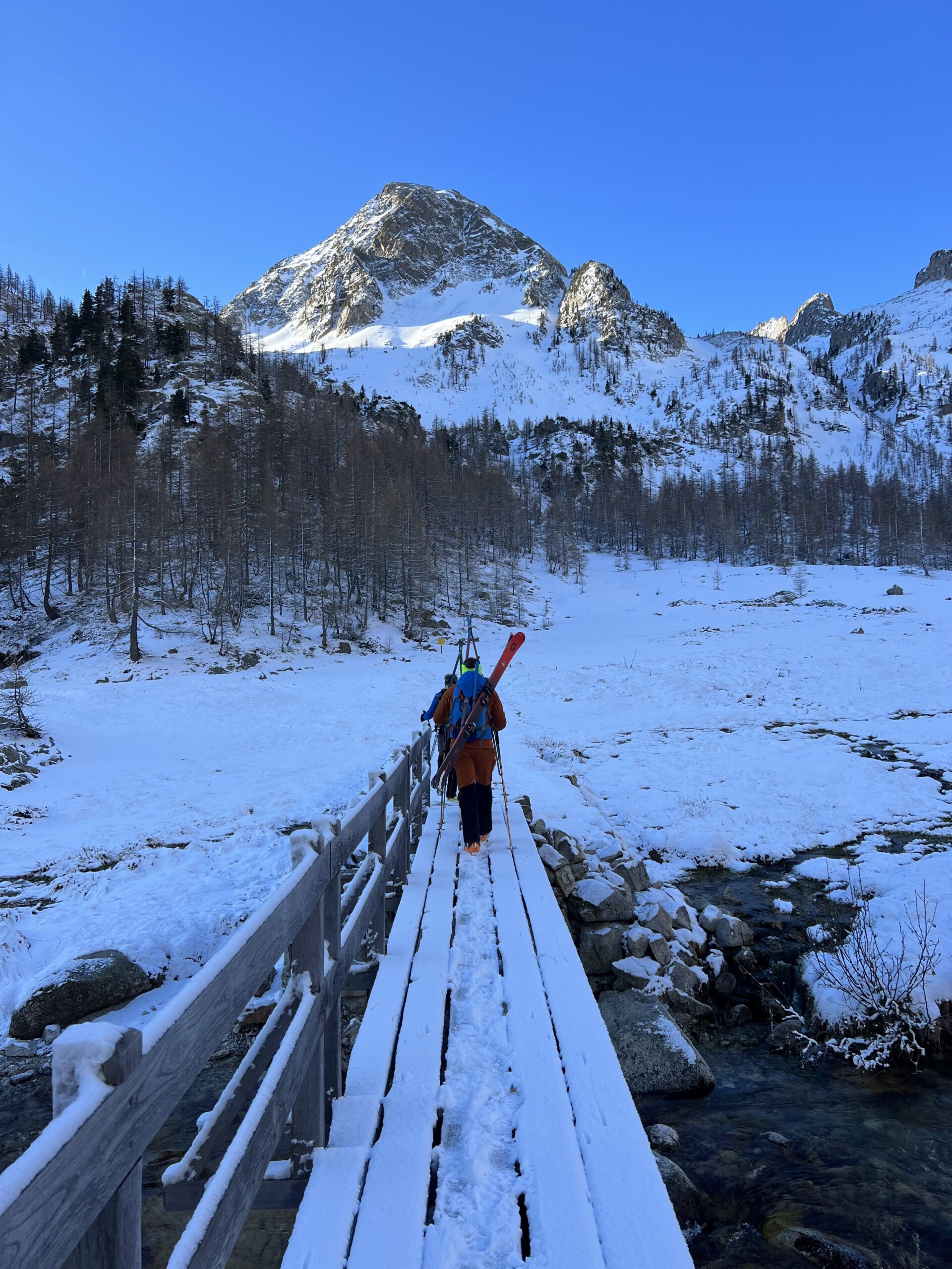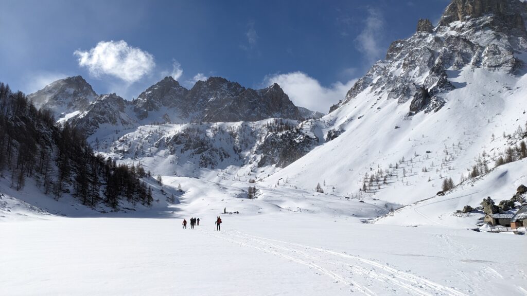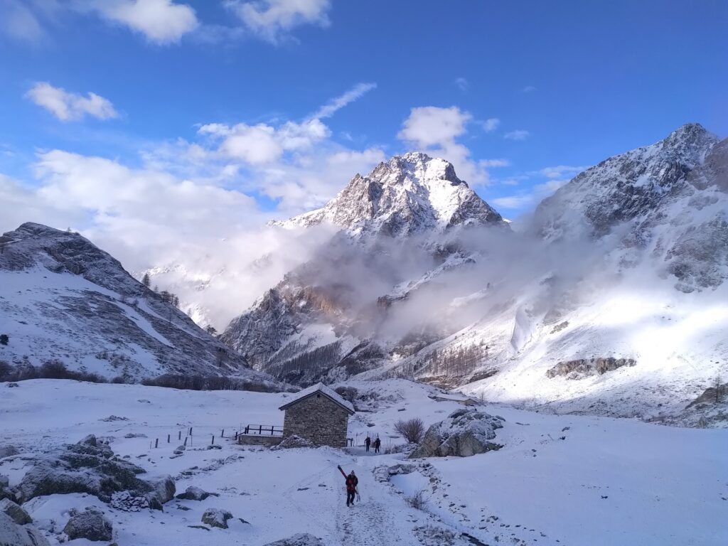 Anche nel secondo giorno, si parte con una lunga fase di portage seguendo la mulattiera del vallone. Mettiamo gli sci ai piedi. Un paio di inversioni complicate dal fondo ghiacciato e dalla spolverata di neve arrivata durante la notte e siamo davanti al rifugio Questa e al lago delle Portette (a 2350 mt).