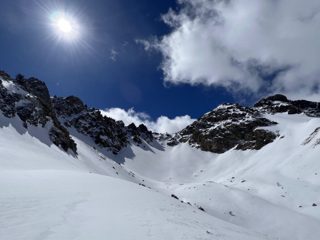 Per la giornata odierna abbiamo alcune mete potenziali, nello specifico il Monte Roisetta, il Petit e il Grand Tournalin. L’idea è quella di decidere in base alle condizioni che troveremo più in alto. Rinfrancati dal bel tempo e dalla bella neve iniziamo a risalire di buona lena il vallone, effettuiamo un lungo traverso che ci porta in un pianoro al cospetto delle tre potenziali cime obiettivo della giornata.