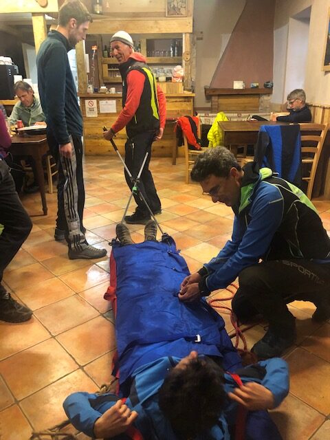 Per completare la formazione di scialpinisti sedicenti “avanzati” viene simulata la preparazione della barella di soccorso che si compone di sci, materassino, struttura in tela con sistema di bloccaggio per l’infortunato (ruolo recitato con particolare pathos da Davide). Montiamo anche i bastoncini per guidare la barella e le quattro corde per sostenerla lateralmente.