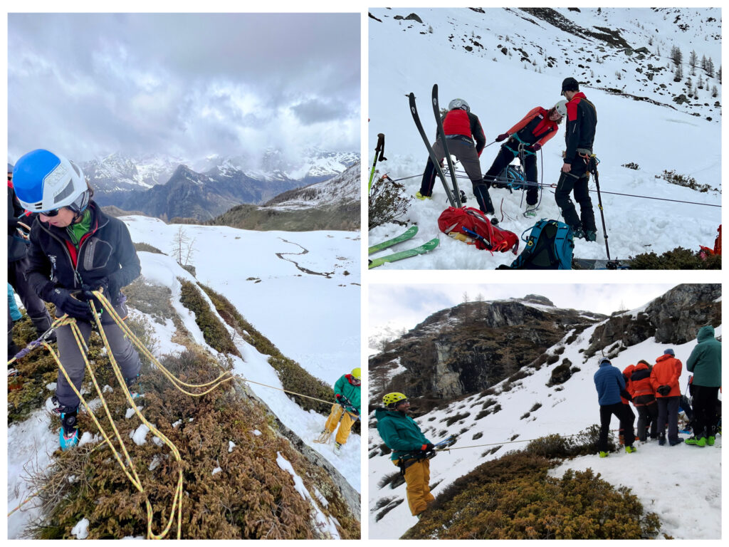 Più in basso ci fermiamo, sono circa le 14 ed effettuiamo un’esercitazione su recupero da crepaccio: un paio di “volontari” vengono appesi tipo salami e parancati su, collaboranti e non.