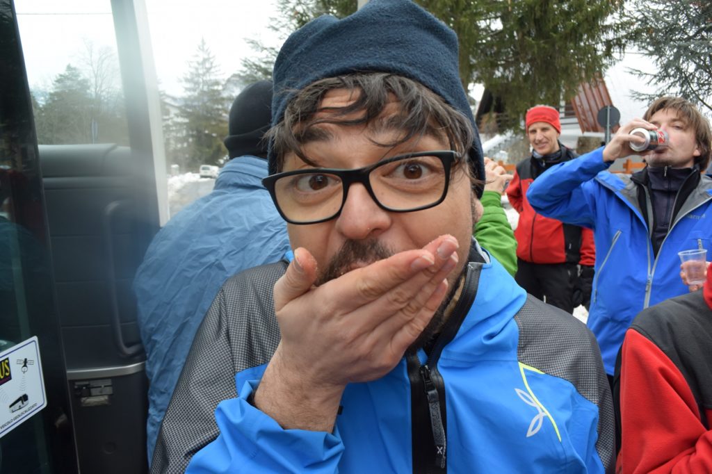 Il leitmotiv della gita è sicuramente il caldo torrido. Gli occhiali mi si appannano continuamente a tal punto che faccio le gucie in braille. La temporanea cecità mi impedisce per lungo tempo di vedere le striature gialle della sabbia del Sahara sulla neve ma mi accodo con fede alle espressioni di sorpresa corali. Poi il calore crescente mi porta in un alterato stato di coscienza con evidenti dispercezioni* sensoriali : il pensiero che sia molto particolare che nel deserto del Sahara ci siano delle striature bianche di neve prende progressivamente forma. Il confronto diretto con molti allievi disidratati, peraltro, mi porta a pensare che si tratti di dispercezioni* di gruppo (fenomeno rarissimo!).