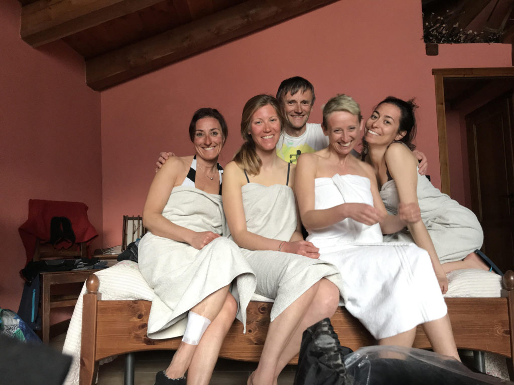 A questo punto, essendo il comune “sparso”, ci si sparpaglia. Chi rimane alla frazione bassa avrà la possibilità di utilizzare la sauna finlandese. Ecco nella foto Alberto nella posizione di utilizzatore finale.