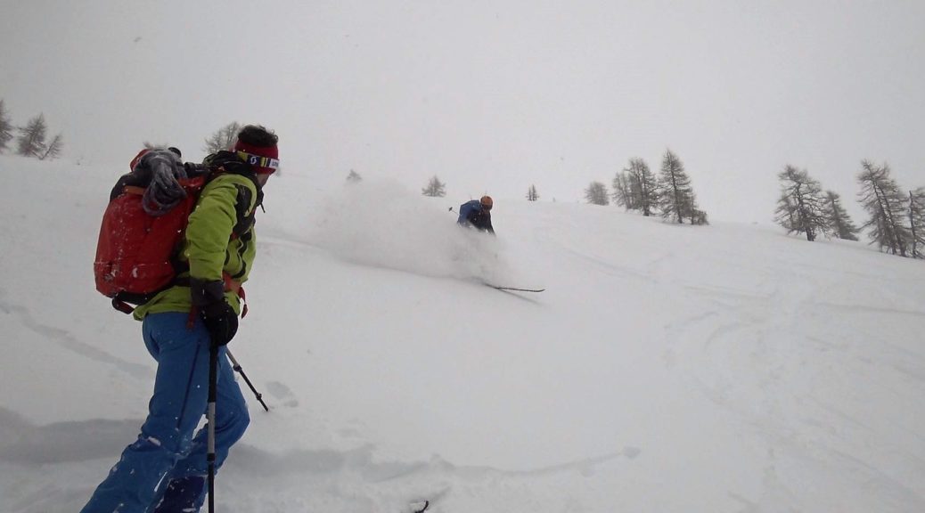 Che Dario abbia preso bene l’idea di potersi occupare della nostra scuola ancora per molto tempo e non dell’Universo intero, lo si capisce dal fatto che, con massima fiducia negli istruttori, si butta a rotta di collo giù dai pendii di Vinavil. Il temuto ordine della “traccia unica” non sembra neanche sfiorare la sua mente.