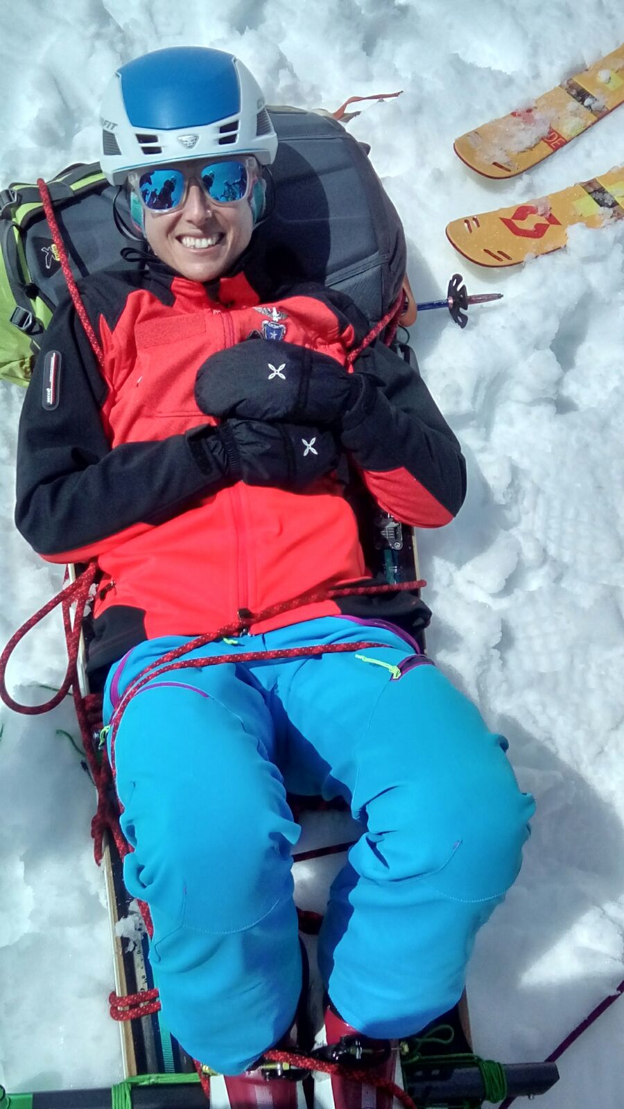 Fantastica dimostrazione con la barella costruita con mezzi di fortuna. Robe da Ars Attack! Prendete due sci, delle bacchette a caso (non si sa di chi), un po’ di corde varie, fate tutti i nodi che conoscete. Fatto? E voilà, un capolavoro. L’idea che una persona con una gamba rotta possa mettersi nella posizione di Francesca lascia spazio a qualche perplessità, ma non perdiamoci nei particolari.