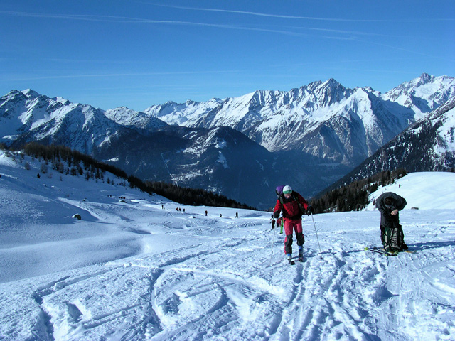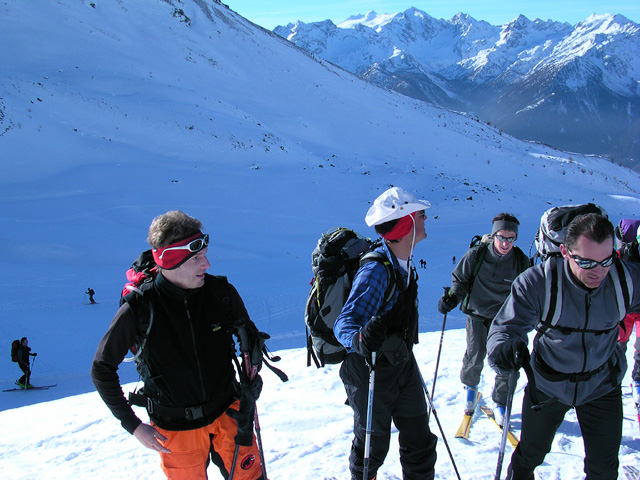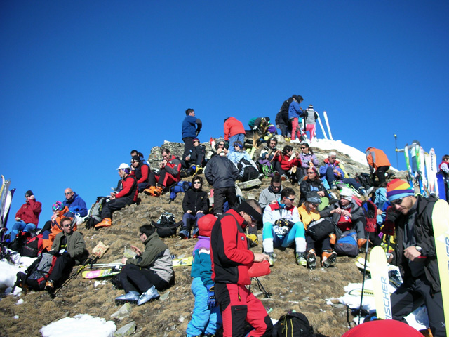 Il 41° Corso di Scialpinismo è ufficialmente iniziato con la prima gita: Punta Testa dei Frà, m 2818 in Valle d’Aosta. La meta ufficiale era il Colle Falita (m 2557), circa 900 m di dislivello, ma una buona parte degli allievi ha raggiunto la vetta macinando senza grossi problemi quasi 1200 m di dislivello! Per il sottoscritto è cosa ardua aprire tutti gli anni le danze delle relazioni delle gite del Corso senza ripetersi e senza cadere nella retorica, ma ogni volta gli allievi sono restii a scrivere, almeno all’inizio. Poi solitamente si disinibiscono. Così anche questa volta mi tocca dare il buon esempio, precisando subito che gli aspetti tecnici del testo possono anche passare in secondo piano e che non ha importanza se la descrizione della neve, dell’ambiente e della traccia sono carenti o approssimativi, nessuno dell’organico istruttori si è mai sdegnato per questo, fino ad ora chi ha scritto delle scempiaggini è stato al limite radiato dal Corso…! Quindi tranquilli e sotto con la penna in mano. Tanto per cambiare un pò, quest’anno faccio tutto al contrario, partendo dalla fine e finendo con l’inizio. Ciò mi permette anche di fare subito un reclamo ufficiale: considerato che la ricerca ARVA compiuta a fine gita dal mio gruppo si è prolungata oltremodo (ovviamente non per incapacità del gruppo a trovare gli ARVA sepolti ma per l’approfondita analisi e la dettagliata descrizione della metodologia di ricerca condotta), arrivati al pullman quasi per ultimi abbiamo trovato il festoso banchetto di fine gita già iniziato e con alcune bottiglie già aperte!! Inaudito!! Non si fanno queste cose al Vicedirettore!! Non abbiamo avuto neanche il tempo di toglierci gli scarponi che abbiamo dovuto buttarci nella mischia per evitare di rimanere con la bocca asciutta. In realtà gli scarponi sono stati utili per crearsi intorno un utile spazio vitale, minacciando di pestare i piedi a chi cercava di sgolarsi le ultime gocce dell’ottimo Moët & Chandon portato dal Direttore per festeggiare il suo compleanno (ma quanti anni avrà mai il nostro sempreverde condottiero?). Fatto sta che gli allievi si sono dimostrati all’altezza della situazione: torte vari gusti, bottiglie di nero, bianco, rosè, birra e altro in abbondanza. Direi tutti promossi! Tornando indietro, la discesa è stata più che buona, con una neve non facile ma bella, che ha messo alla prova la capacità di “sciare leggeri, sena forzare e adeguando il tipo di sciata nonché la posizione del corpo nel suo insieme alle frequenti variazioni della morbidezza del manto nevoso”, chiaro no? Divertente la strada nel bosco a valle, bella la neve nella parte mediana, panoramica e tecnica la cresta che dal colle sale alla vetta. Ehi!, ma nel nostro cammino a ritroso siamo arrivati finalmente in vetta! Bellissima e con un panorama incantevole, si vedeva praticamente tutto (non ho individuato l’Etna, forse era coperto da qualche punta…). La mancanza totale di nuvole e un sole meraviglioso hanno poi favorito l’appagamento fisico e spirituale raggiungibile solo in cima ad una montagna! Venendo alla salita, questa si è svolta senza grossi problemi, in un ambiente sempre vario, interessante e didattico, con gli allievi che hanno superato (più o meno) agevolmente le difficoltà tecniche delle prime inversioni. Ed ecco che siamo arrivati all’inizio…