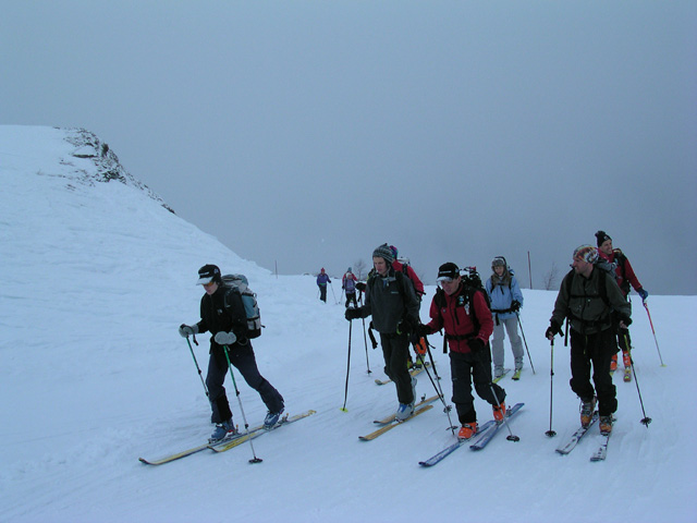 Così facciamo, la troviamo deserta e dopo un’altra oretta di scarpinata – durante la quale ci attorcigliamo le ginocchia cercando provare nuovi tipi di inversioni – arriviamo in cima, sotto una bella nevicata. Classico rituale: cambio abito, cibo e bevande calde, ci togliamo le pelli e scendiamo lungo la pista. Neve buona, peccato la brevità della discesa!