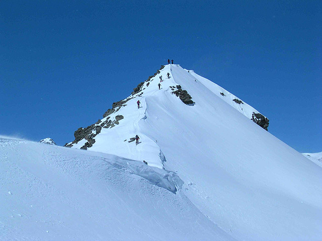 Arrivati in cima occhieggiamo verso il vallone che si apre. Magnifico cielo azzurro e paesaggio mitico. In lunga serie di inversioni raggiungiamo la Punta Paletta, che per poco non s’innalza fino a quasi 3000 metri. In cima una bella vista tutto attorno, accompagnata da un piccolo spuntino – nessuna meraviglia che il parco si chiami Gran Paradiso. Dopo la sosta in vetta, purtroppo soltanto piccola, scendiamo in una bella neve fresca dall’altra parte della sella, giù verso la nostra meta, il rifugio Benevolo a quota 2.285 metri.
