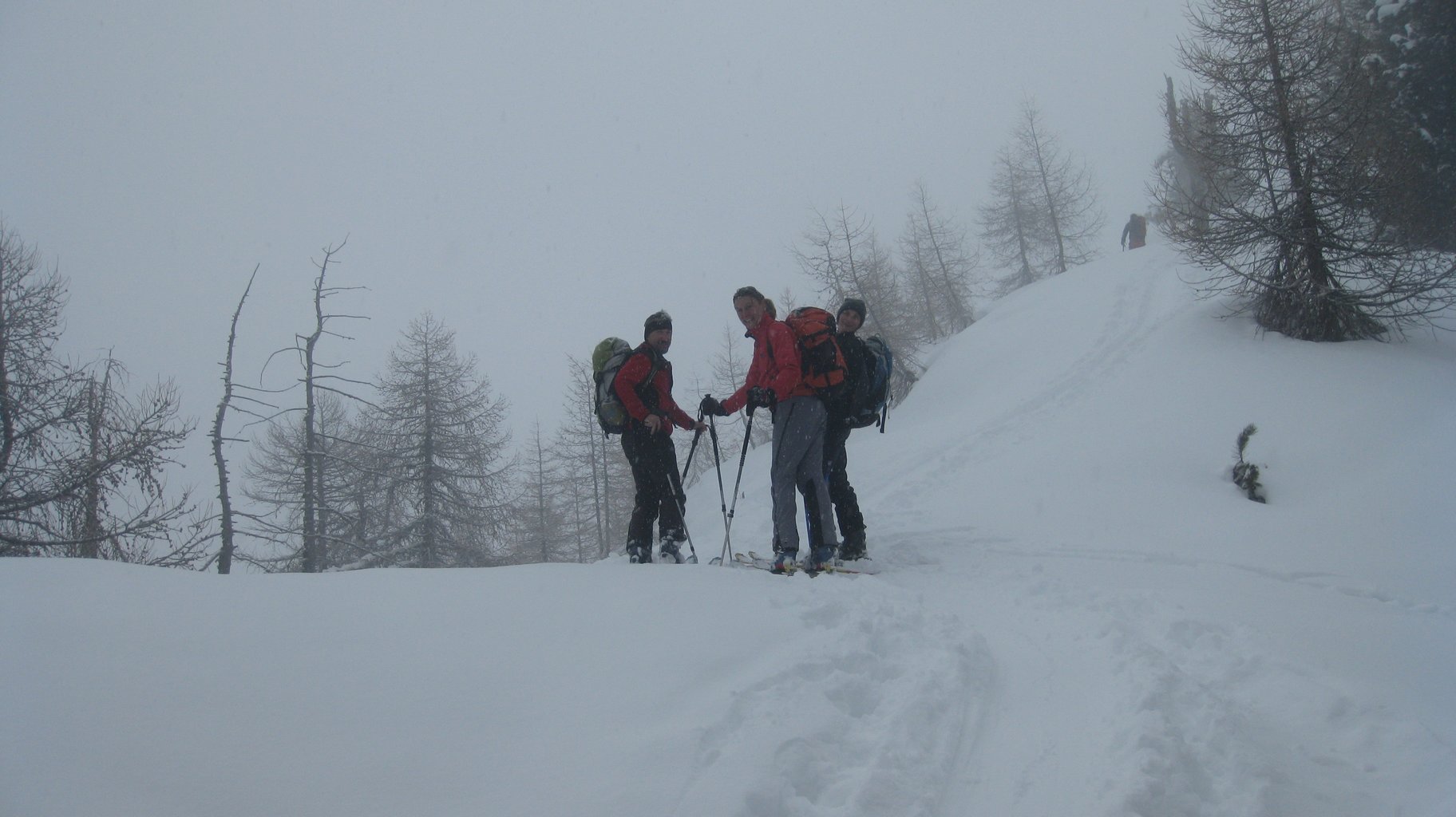 A scanso di ogni equivoco, proprio nel momento in cui ci si accinge a sistemare gli attacchi in posizione di discesa e a irrigidire lo scarpone per dedicarsi all’arte molto naif delle pennellate con sci su neve fresca un timido sole penetra la spessa coltre nebulosa e mostra ai pochi presenti l’altro fronte della valle. Ah, ma allora c’è anche un altro versante!