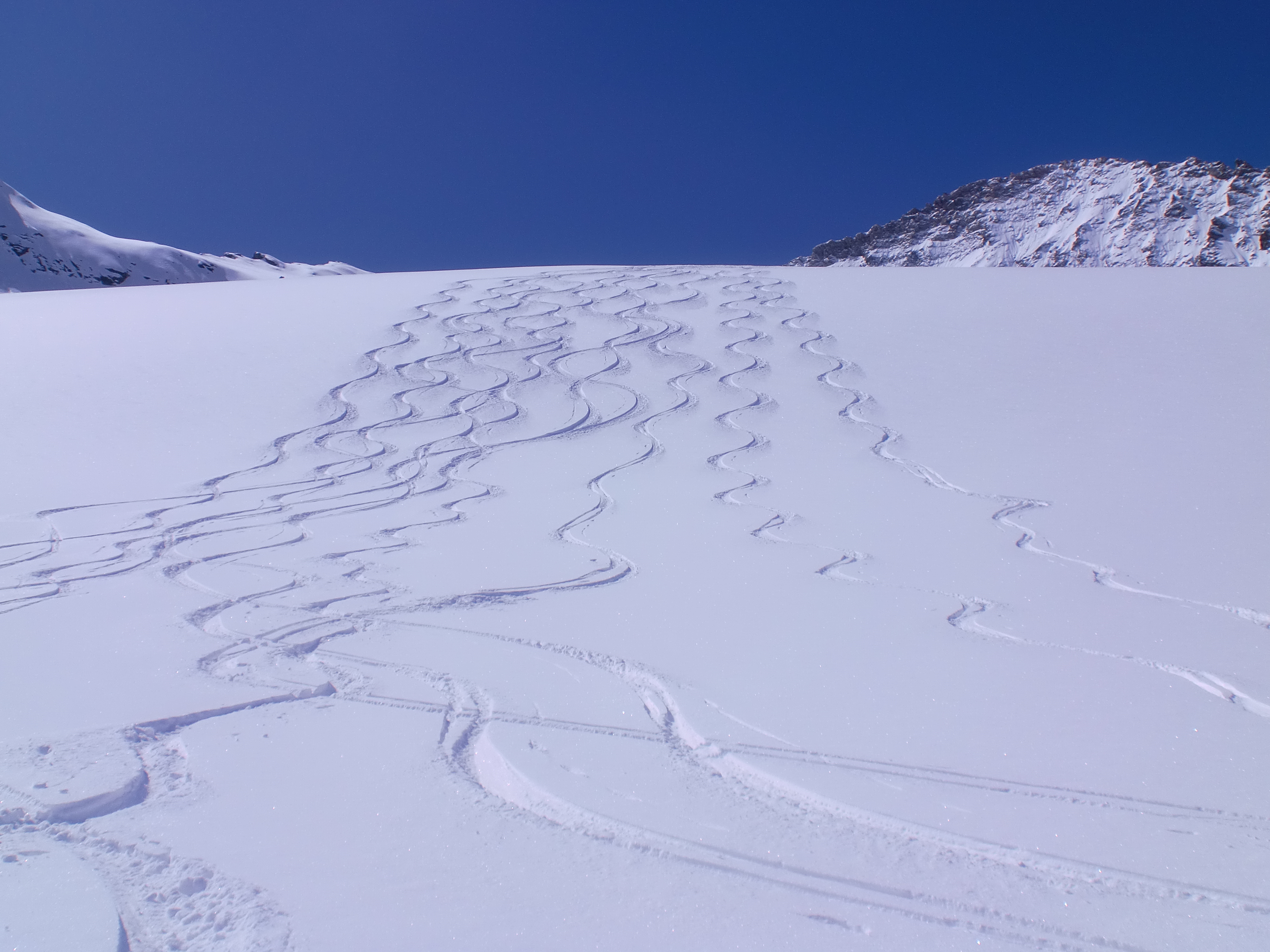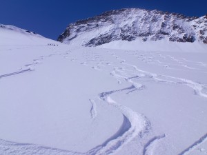 Dai 30 ai 40cm di neve fresca erano caduti nella giornata di venerdì e l’abbondanza di “fresca” ha regalato una discesa di prim’ordine ai 20 partecipanti sul magico ghiacciaio di Arnas sottostante la vetta sciistica della Punta Maria. Tant’è vero che una dozzina tra istruttori e allievi hanno ripellato da sotto il colle di Arnas su nuovamente sino in vetta per ripetere la fantastica discesa.