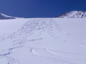 E qui sotto, a parte, le foto delle stupende tracce lasciate da istruttori e allievi sul ghiacciaio di Arnas.