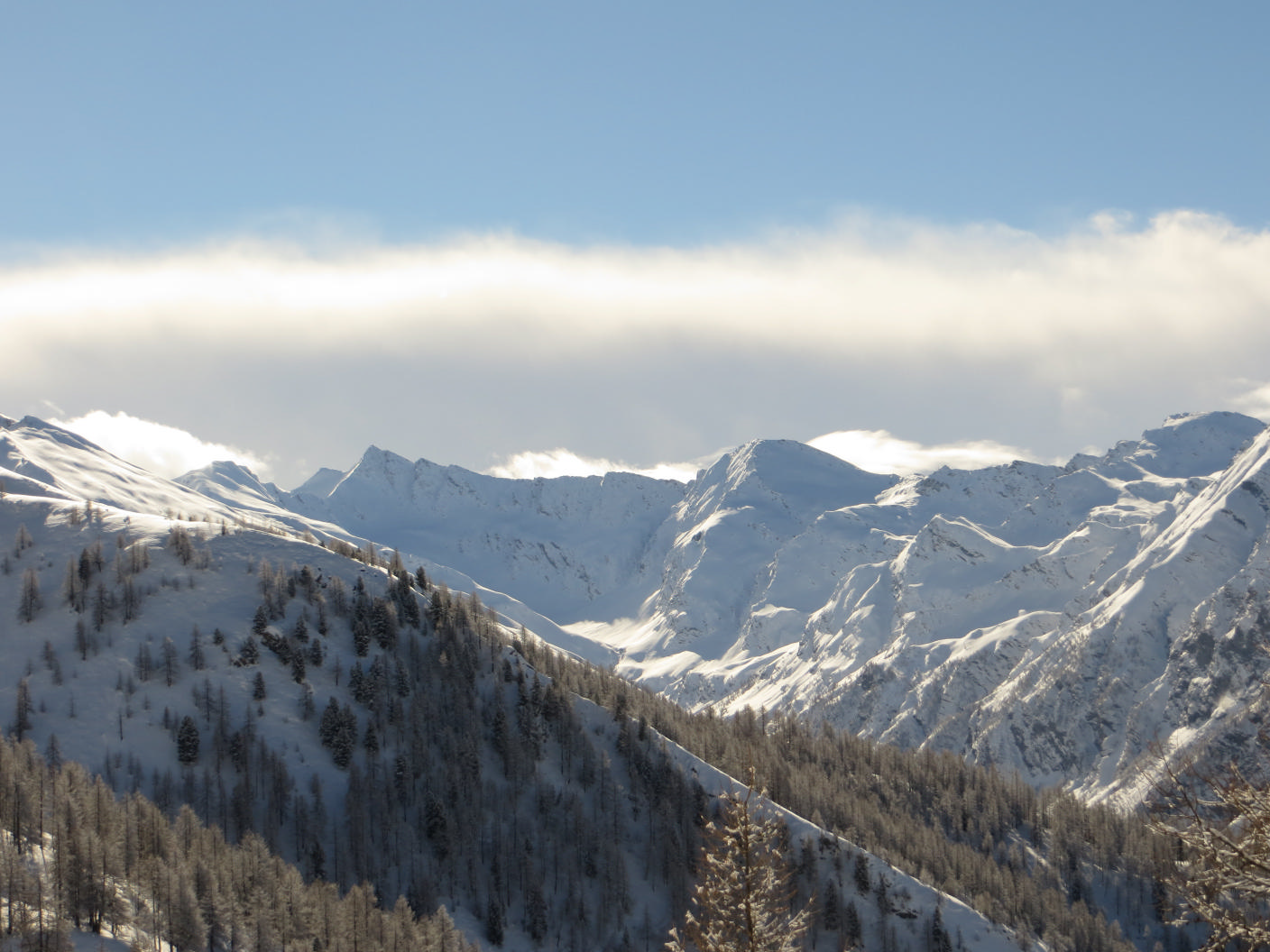 In meno di mezz’ora arriviamo finalmente in cima al Clot della Soma: vista spettacolare su Pragelato, Sestriere e tutte le valli intorno. Il clima è ancora piacevole e ci rilassiamo un momento.