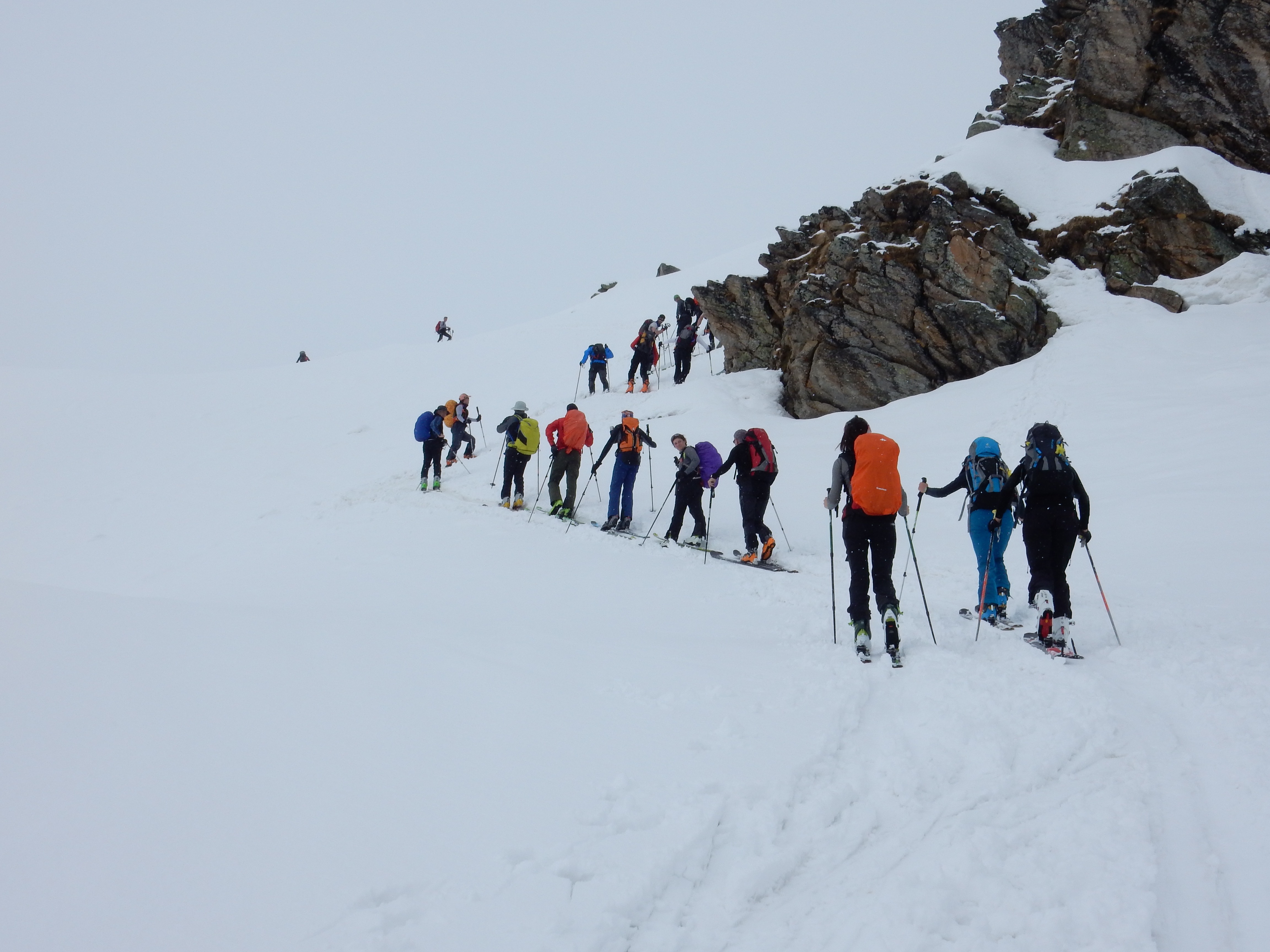 Giunti dove il pendio si fa più ripido i gruppi si distanziano per non sovraccaricare troppo il terreno su cui si è depositato un nuovo strato di neve. Si crea un piccolo ingorgo a valle di un “canalino” che richiede qualche gücia un poco più impegnativa e questo ci concede una piccola pausa.