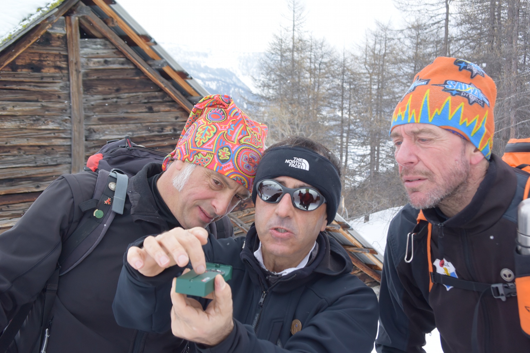 E siamo in vetta, ormai siamo una grande famiglia: si ride, si scambiano le libagioni varie, si fa salotto un pò a nord, a sud , a ovest ed a est… E dopo tutto questo riposo e un “summit” degli istruttori si decide di partire “in coda” facendo una traccia controllata, la neve è pesante e la sicurezza prima di tutto. Per fortuna, non tutti i pendii hanno la stessa esposizione, la neve cambia e c’è anche spazio per una bella sciata in libertà quasi in neve fresca. Oggi ci sono le condizioni per tutto, anche per un bel ripasso di ricerca Artva con gli occhi e le orecchie molto vigili di Livio e di Dario. Per finire, una bellissima discesa in mezzo al bosco prima della stradina di ritorno a Nevache.