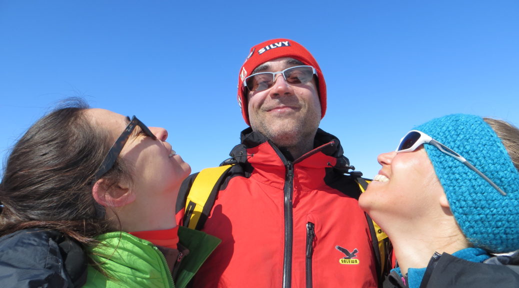 In questa salita del 2018, c’erano invece molti amici assenti tre decenni fa. Innanzitutto, i miei compagni di cordata, Enrico, in versione Gandalf il grigio, e Thea. C’era Loby, che ha vomitato il piloro, in cima ha rifiutato la mia crema di peperoni, ma in cima stoicamente ci è arrivata. C’era Laura, che ha fatto una grande relazione, ma una strepitosa salita; l’ho battezzata la “vestale dello sci alpinismo mite”, ma mi sto ricredendo… ripellare è una pratica inconciliabile con la nostra dottrina. C’era la Resty, che affronta i pendii con piglio di virgo bellatrix, vergine guerriera, novella Camilla di virgiliana memoria, ma sfoggia all’occorrenza un cuore di mamma, pronta a soccorrere un’allieva accasciatasi al suolo, accasciandosi accanto a lei. C’era Luca, che continua brillantemente la tradizione della tribù dei Berta, le guide navajos del CAI UGET. C’era Sara Dughi, che praticamente ho visto in fasce ed ora sprinta sui pendii (se la carica di Diretùr fosse ereditaria, saremmo già a posto per il prossimo mezzo secolo…). C’era quel persistente odore di fiori di arancio che ci ha accompagnato per tutta la stagione… C’era – ma non solo domenica, anche trent’anni fa – il mio fedele imbrago, complicato, obsoleto, ma a cui sono tremendamente affezionato.. Lo so, lo sci alpinista moderno ormai segue la settimana della moda a Milano per individuare il colore per l’attrezzatura, ma io sono “antico”, come dicono i miei figli…