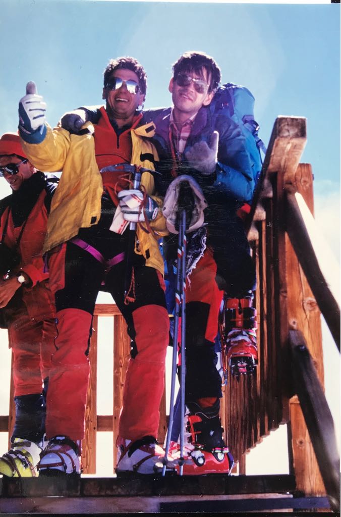 Tra i compagni della salita alla Gniffetti del 1990 non posso non ricordare Aldo Frola, mitico istruttore della mia giovinezza, che vedendomi spalmato a terra nei pressi del Col del Lys (mi sentivo come un alpino in ritirata dal Don…), mi incoraggiò, non amorevolmente come ora fanno gli istruttori, ma con lo stile del tempo: un laconico e perentorio “Così su non ci arrivi, non fermati più e tieniti attaccato alle code dei miei sci”.