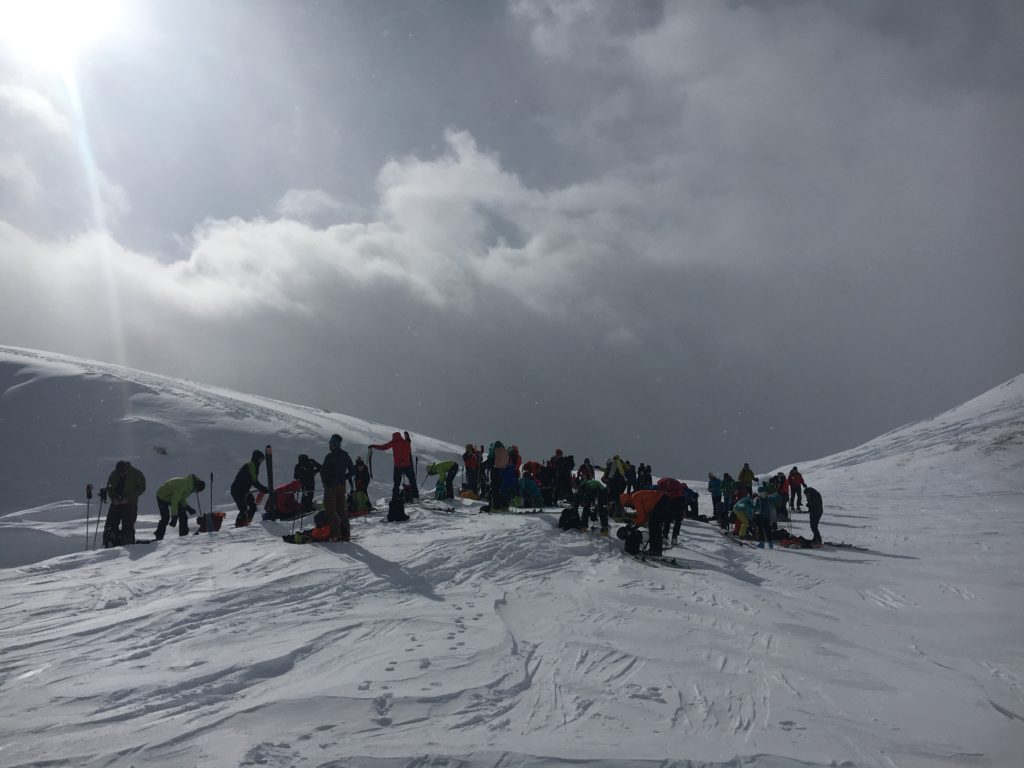 Siamo un po’ abbacchiati.. si diffondono fake news sulla volontà del Diretur di fare una ricerca Artva in punta, che richiederebbe uno scongelamento al microonde dell’intera brigata. Invece nulla di tutto ciò; si scende, con una gradita sorpresa: la discesa è sulle piste, in condizioni più che buone.